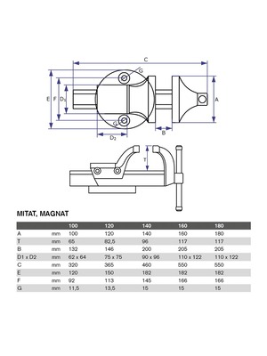 DURLACH Magnat ruuvipuristin 140mm Durlachin rikkoutumaton huippulaaturuuvipenkki Magnat on valmistettu takoterästä ja karkaistu. Säädettävä ohjaus. Erittäin suuri kiinnityspituus. Suusi alasin oikaisu– ja tyssäystyöskentelyä varten. Jyrsityt, karkaistut kiristysleuat. Kiinnityskorvat erikoisleukoja