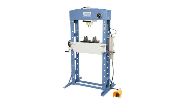 Järeä rakenteinen, paineilmakäyttöinen Bernardo PWK 50 F konepajapuristin jalkapolkimella.Hydraulipuristinta voi käyttää käsikäytöllä tai vaihtoehtoisesti paineilmalla käyttäen käsikahvaa tai jalkapoljinta.