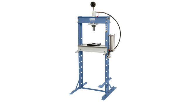 Lattiamallinen hydraulipuristin 20 t puristusvoimalla.Prässiä käytetään joko käsikäytöllä tai jalkapolkimella.